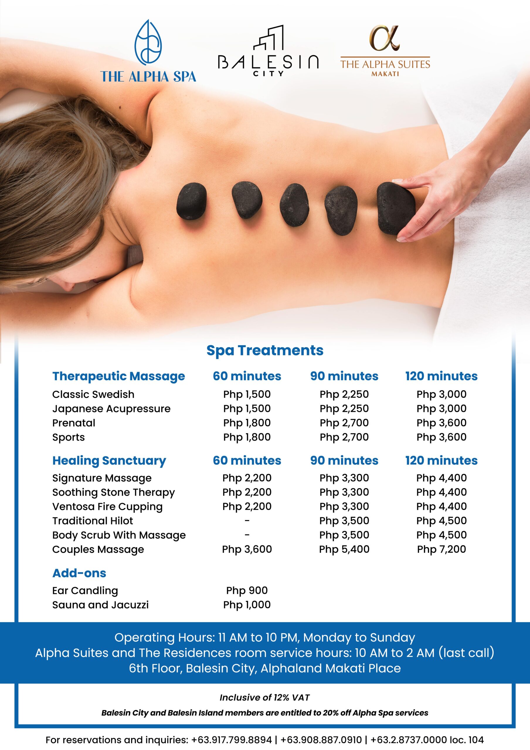 The Alpha Spa offers a serene escape from hectic city life with treatments like Japanese Acupressure, Swedish Massage, Hilot, Sports Therapy, Ventosa, and Prenatal Massage. All services and amenities, including the Hammam, Sauna, and Jacuzzi room, promote muscle relaxation and improved mobility, while minimalist interiors and soothing music create a holistic revitalizing experience.