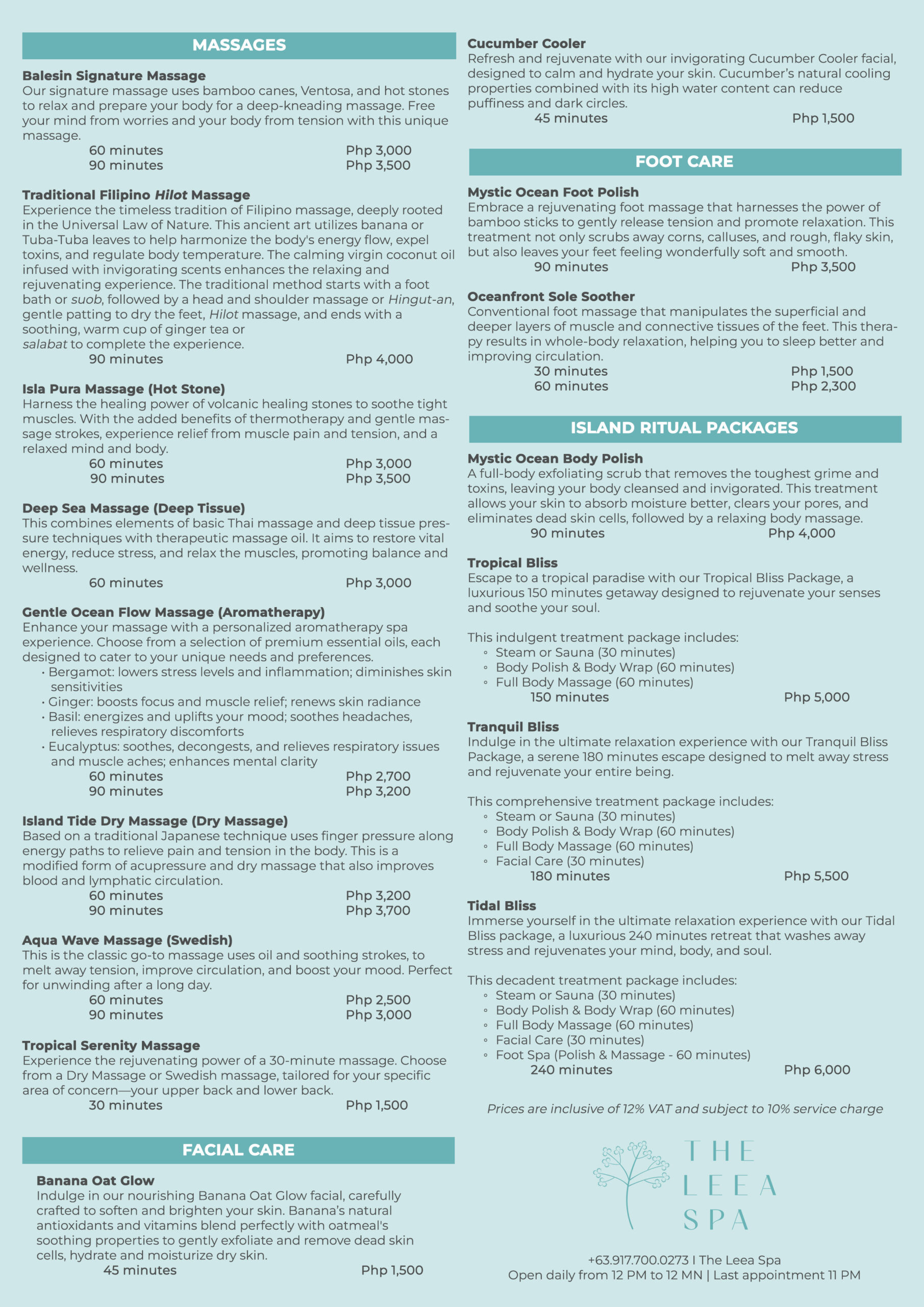 Indulge your senses at The Leea Spa, whose name is derived from the Leea flower found in the forests of Balesin. Well-trained therapists provide guests with the pampering they deserve, from relaxing massages to invigorating scrubs.