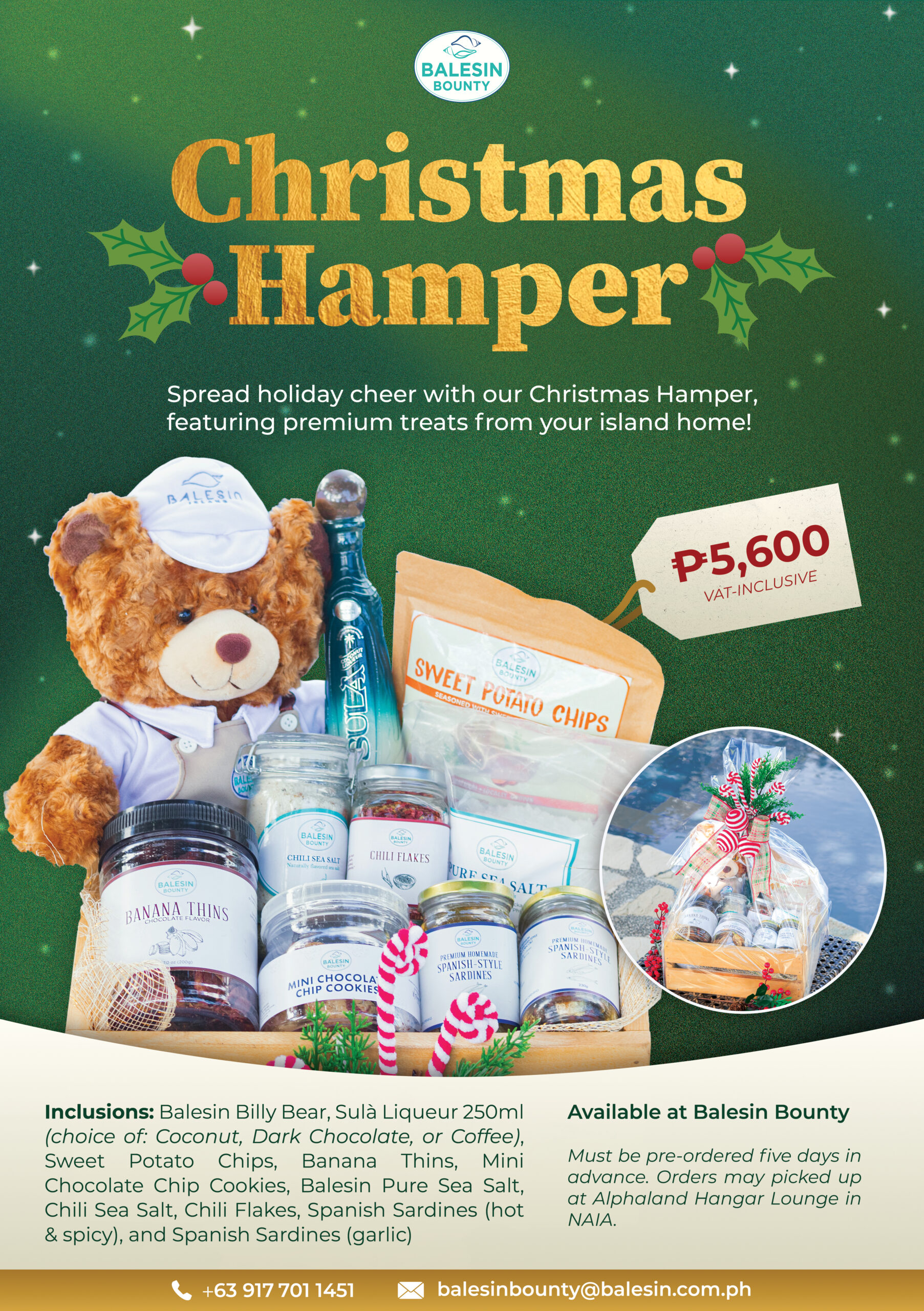 Balesin Billy Bear, Sulà Liqueur 250ml (choice of: Coconut, Dark Chocolate, or Coffee), Sweet Potato Chips, Banana Thins, Mini Chocolate Chip Cookies, Balesin Pure Sea Salt, Chili Sea Salt, Chili Flakes, Spanish sardines (hot & spicy), and Spanish sardines (garlic)