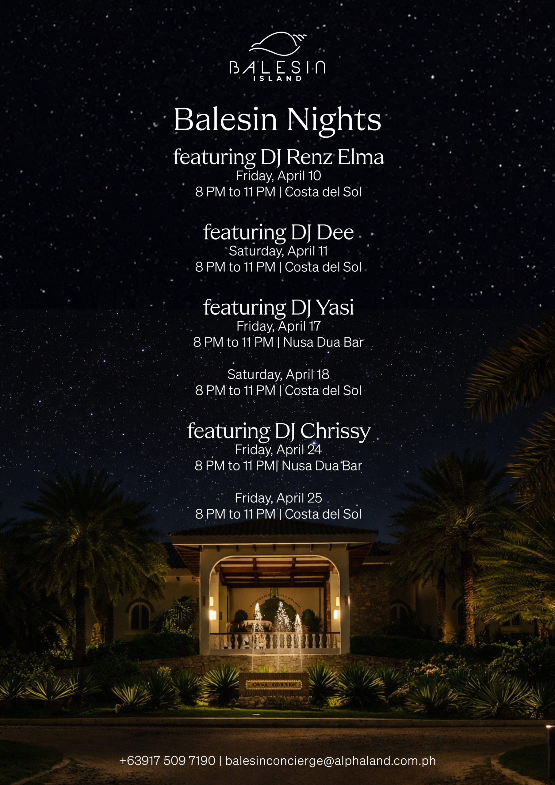 Friday, April 10 to Friday, April 25 | 8:00 PM to 11:00 PM | Nusa Dua Bar / Costa del Sol