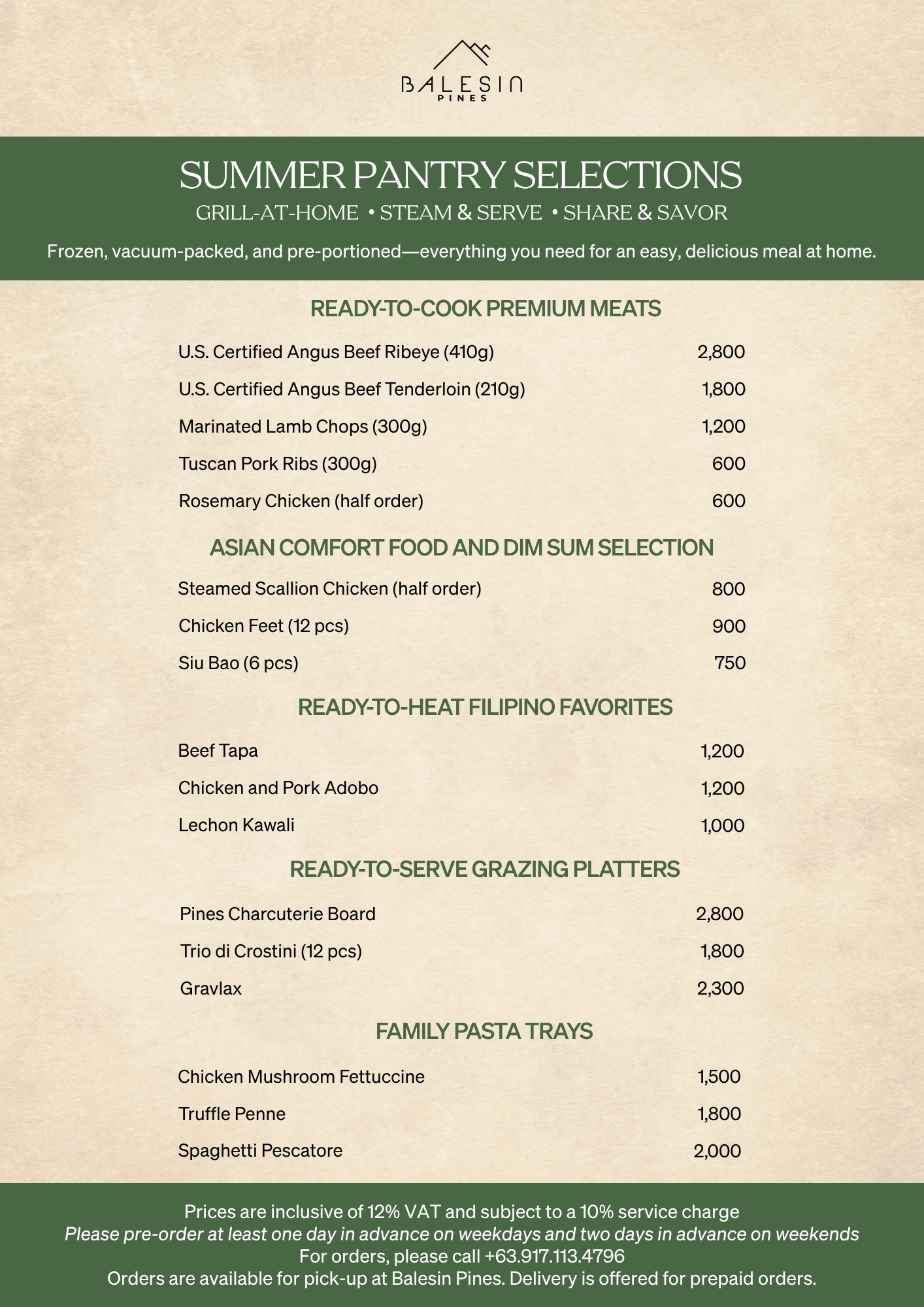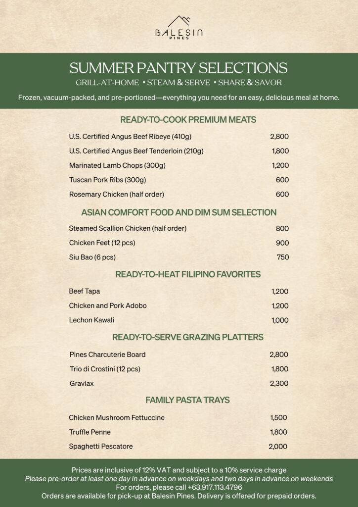Orders are available for pick-up at Balesin Pines. Delivery is offered for prepaid orders.